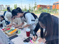 校园广播台每日午间和晚间播出《为你读诗》栏目,精选中国古代和近现代优秀诗作10余篇。活动期间,广播站播音员以“自然音效+分段朗读”形式诠释《春江花月夜》等作品,午间及晚间10分钟成为师生期待的“心灵SPA”时刻。6月上旬在两校区设置的“漂流书签”摊位,吸引师生通过诗句传递情感。活动累计回收手写诗签200余张,同学们将古今中外富有哲思的诗句段落书写在精美的漂流书签上,以此疏解情绪、表达情感。