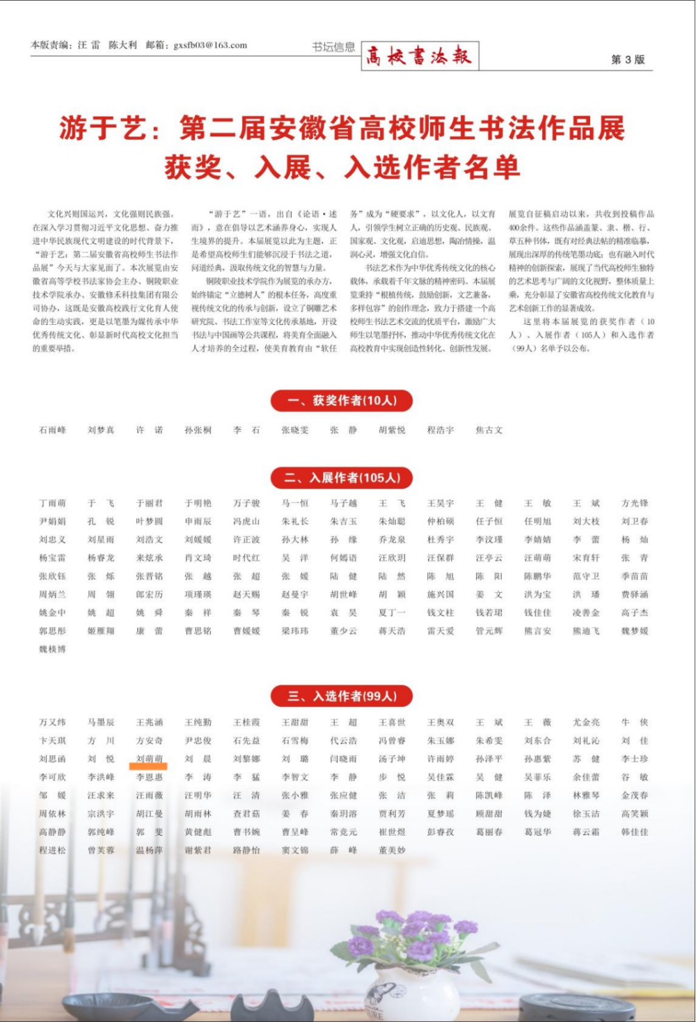 本次展览由安徽省高等学校书法家协会主办,铜陵职业技术学院承办,旨在弘扬中华优秀传统文化,展示我省高校师生的书法艺术风采。活动共收到投稿作品400余件,经专家严格评审,最终仅评选出获奖及入展、入选作者214人。刘萌萌同学的作品能在此高规格、高竞争性的省级展赛中占得一席之地,实属不易,充分彰显了我校学子深厚的人文素养和艺术潜质。